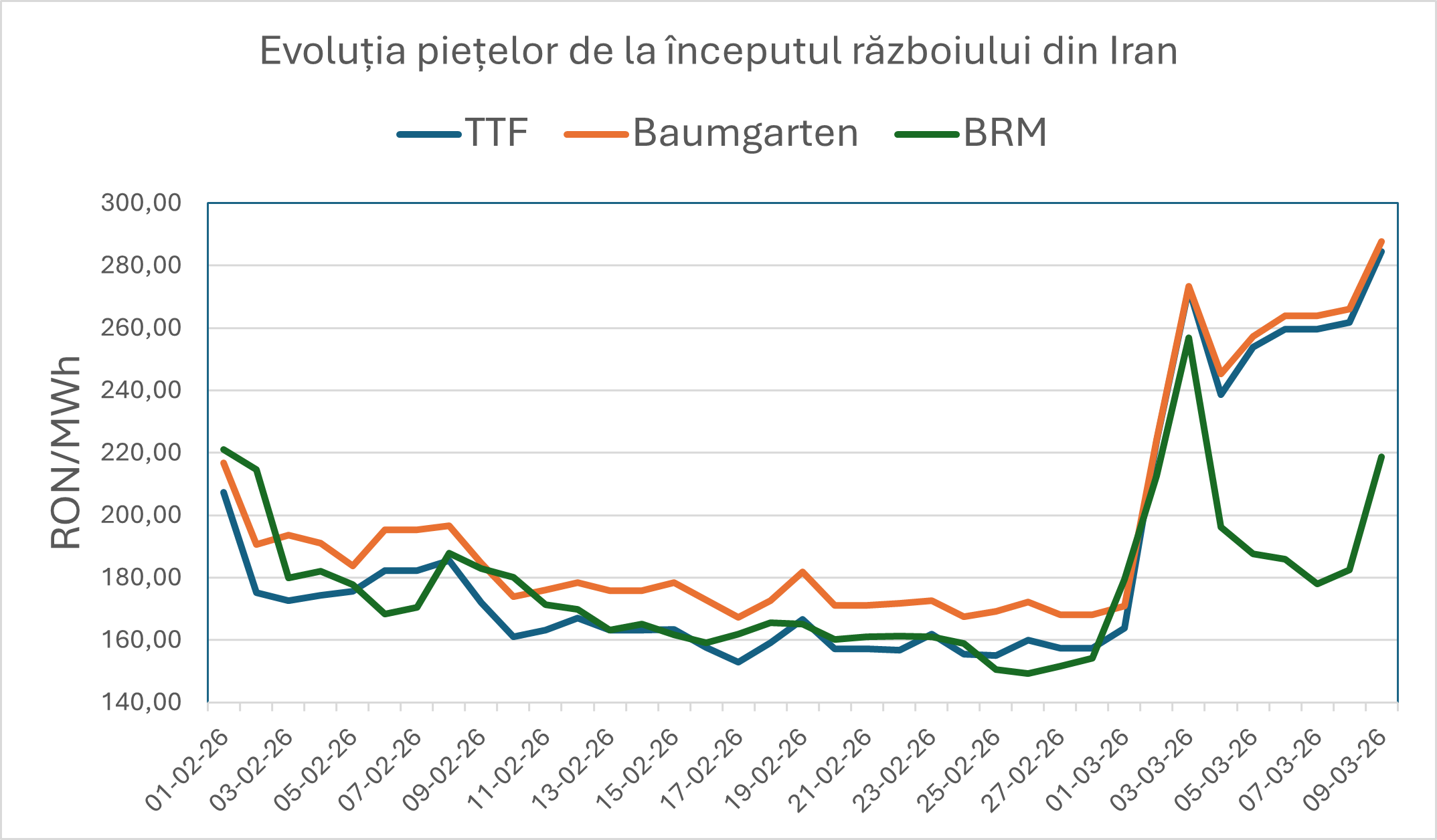 Reacția piețelor vest-europene este vizibilă și în context regional. Mișcările de preț apar mai întâi în hub-urile cu lichiditate ridicată, precum TTF, și sunt ulterior transmise către piețele din Europa Centrală și de Est. Graficul comparativ dintre România, Olanda și Austria surprinde tocmai acest mecanism de propagare: direcția generală a evoluțiilor este comună, chiar dacă ritmul și amplitudinea diferă de la o piață la alta.